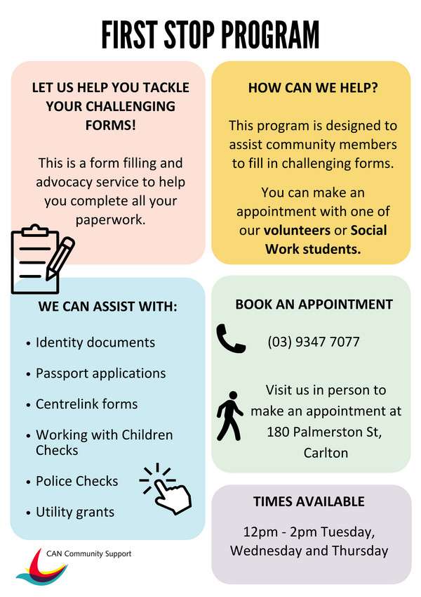 Our First Stop program is facilitated by university students and volunteers. Our volunteers are available to help local people with those challenging forms – identity documents, working with children’s checks, Centrelink forms, passports as well as utility relief grants and more.